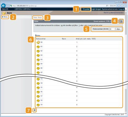 Viser en liste over bokse. Du kan åbne en boks for at kontrollere detaljerede informationer om de dokumenter, der er gemt i boksen, samt udskrive og slette dokumenterne. Udskrivning af et dokument, der er gemt på maskinen (gemt jobudskrivning)