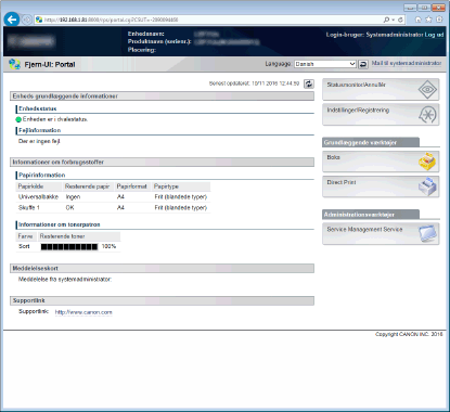 [Administrationsstatus]Du kan foretage alle handlingerne og indstillingerne i Brugerinterface til fjernbetjening. Angiv systemadministratoradgangskoden i [Password].