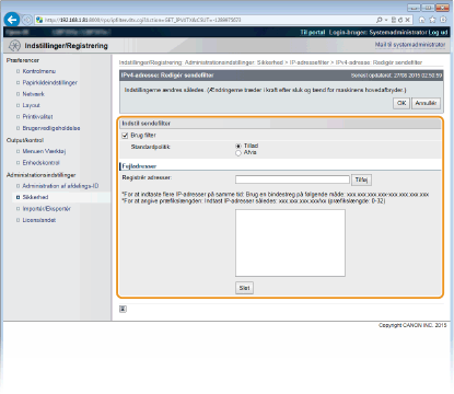 4 | Markér afkrydsningsfeltet [Brug filter], og klik på [Afvis] eller alternativknappen [Tillad] for [Standardpolitik]. [Brug filter] Markér afkrydsningsfeltet for at begrænse kommunikation. Ryd afkrydsningsfeltet for at deaktivere begrænsningen. [Standardpolitik] Vælg betingelsen for at tillade eller afvise andre enheders kommunikation med maskinen. [Tillad] | Vælg for at blokere kommunikationspakker, når de sendes til eller modtages fra enheder, hvis IP-adresser er indtastet i [Fejladresser]. Kommunikation med andre enheder er tilladt. | [Afvis] | Vælg for kun at godkende kommunikationspakker, når de sendes til eller modtages fra enheder, hvis IP-adresser er indtastet i [Fejladresser]. Kommunikation med andre enheder er ikke tilladt. |