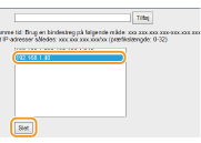 Hvis du vælger [Tillad] under [Standardpolitik], skal du angive IP-adresserne for enheder, hvor kommunikationen med maskinen burde være blokeret. Hvis du vælger [Afvis] under [Standardpolitik], skal du angive IP-adresserne for enheder, der burde kunne kommunikere med maskinen.