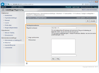 2 | Angiv adresseundtagelser. Indtast IP-adressen (eller IP-adresseområdet) i [Registrér adresser]. For at angive et portnummer skal du vælge afkrydsningsfeltet [Angiv portnummer], indtaste et portnummer i [Portnummer] og klikke på [Tilføj]. Kontrollér, om der er indtastningsfejl Hvis IP-adresserne eller portnumrene er indtastet forkert, kan du muligvis ikke få adgang til maskinen fra Brugerinterface til fjernbetjening. I dette tilfælde skal du angive <Adressefilter> til <Fra>. AdressefilterSådan slettes et indstillet portnummer Vælg det portnummer, der skal slettes, og klik på [Slet]. |