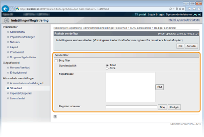 Vælg for at begrænse dataafsendelse fra maskinen til en computer ved at angive MAC-adresser.