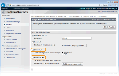 Denne godkendelsesmetode anvender et brugernavn og en adgangskode til klientgodkendelse og et CA-certifikat til servergodkendelsen. MSCHAPv2 eller PAP kan vælges som internetprotokollen. TTLS kan bruges med PEAP samtidigt. Aktiver TLS for Brugerinterface til fjernbetjening, før du konfigurerer denne godkendelsesmetode (