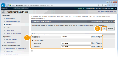 3 | Indstil brugernavnet og adgangskoden, og klik på [OK]. [Brugernavn] Angiv alfanumeriske tegn for brugernavnet. [Skift password] Hvis du vil indstille eller ændre adgangskoden, skal du markere afkrydsningsfeltet og angive alfanumeriske tegn for den nye adgangskode både i tekstfeltet [Password] og [Bekræft]. |
