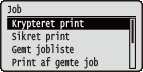 ![]() | Du kan udskrive dokumenter, der er gemt på SD-kortet, samt en udskriftslog. Hvis du trykker på ( ) på kontrolpanelet, vises menuen Job. Du kan angive indstillingerne, der er beskrevet nedenfor, hvis maskinen er offline. |