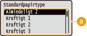 Udskrivningen vil blive udført med den her indstillede papirtype, hvis [Papirtype] er indstillet til [Printerstandard] i printerdriveren, og hvis typen af det papir, der er lagt i papirkilden, er indstillet til <Blandede typer> på maskinen. |