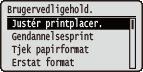 ![]() | Indstillinger om justering af maskinen, herunder udskrivningspositionskorrigering for hver papirkilde og forbedring af udskrivningskvaliteten, vises med korte beskrivelser. Du kan konfigurere disse indstillinger, hvis maskinen er offline. Standardindstillingerne er angivet med en daggert ( ). |