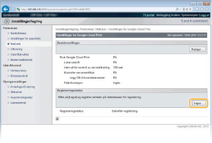 Du må aktivere Google Cloud Print. Klikk på [Rediger], merk av for [Bruk Google Cloud Print] og klikk på [OK].