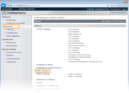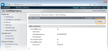 SMB støtter bare NetBIOS over TCP/IP og støtter ikke NetBEUI. Konfigurer IP-adressen før du konfigurerer SMB-innstillingene. Stille inn IP-adresserSMB er bare aktivert når det valgfrie SD-kortet er installert i maskinen. |