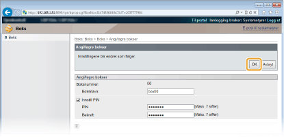 Du kan angi et navn på en boks og en PIN-kode for å åpne den. Hvis du angir et vennlig navn på boksen, kan du identifisere boksen ganske enkelt når du velger plasseringen for å lagre dokumenter ved bruk av skriverdriveren. Hvis du angir en PIN-kode, kan bare et begrenset antall brukere få tilgang til de lagrede dokumentene, noe som øker sikkerheten.