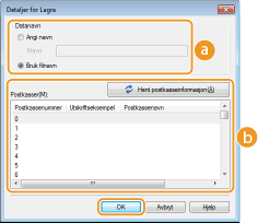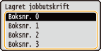 [Postkasser]Et sted som brukes til å lagre data i SD-kortet kalles for en boks. Velg tallet på boksen som skal lagre dokumentet. Du kan tilordne et navn på boksen for å lette identifisering av boksen.