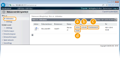 Du kan kontrollere utskriftsstatusen (skrives for tiden ut eller venter på å bli skrevet ut) til dokumenter som skal skrives ut fra en datamaskin, og slette eller avbryte dokumenter.