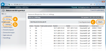 Utskriftshistorikken og e-postmottakshistorikken vises i form av en liste.