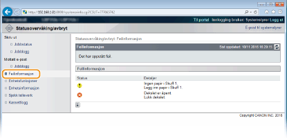 Hvis det oppstår en feil, vises denne siden ved å klikke på meldingen som vises under [Feilinformasjon] på portalsiden (hovedsiden).