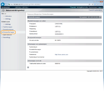 Informasjon om maskinen og systembehandleren vises. Denne informasjon har blitt angitt i [Sikkerhet]