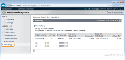 Du kan kontrollere loggene over brukte tonerkassetter.