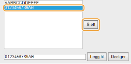 Du trenger ikke skille adressene med bindestreker eller kolon. Kontroller om det finnes inntastingsfeil Hvis MAC-adresser blir angitt feil, kan det hende at du ikke får tilgang til maskinen fra Fjernkontroll. I så fall må du angi <Adressefilter> til <Av>. AdressefilterNår du har valgt [Avvis] under [Standardpolicy] Utgående flerkastings- og kringkastingspakker kan ikke filtreres. Slette en MAC-adresse fra unntak Velg en MAC-adresse, og klikk på [Slett]. |