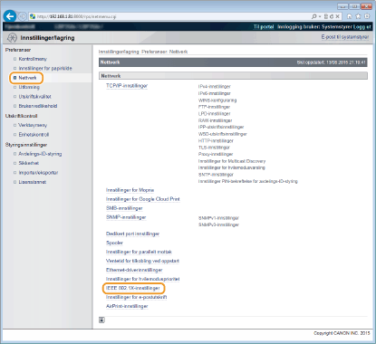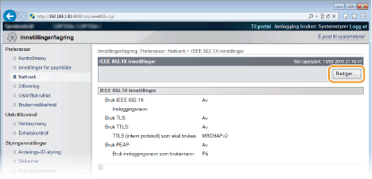 Bruke betjeningspaneletDu kan også aktivere eller deaktivere IEEE 802.1X-autentisering via innstillinger-menyen på betjeningspanelet. IEEE802.1X |
