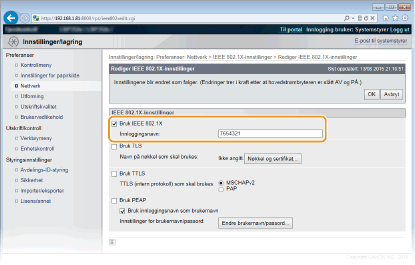 Merk av for [Bruk IEEE 802.1X], skriv inn påloggingsnavnet i tekstboksen [Innloggingsnavn], og angi de obligatoriske innstillingene.