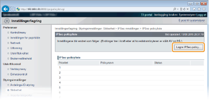 For å bruke IPSec for kryptert kommunikasjon må du registrere sikkerhetspolitikker (SP) før du aktiverer IPSec-innstillingene (