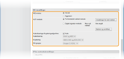 Når den aggressive modusen er valgt i [IKE-modus], krypterer ikke [Forhåndsdelt nøkkel-metode]-innstillingen den delte nøkkelen.