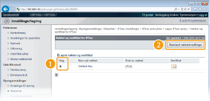 2 | Velg nøkkelparet du ønsker å bruke og klikk på [Standard nøkkelinnstillinger]. Vise detaljer for et nøkkelpar eller sertifikat |
