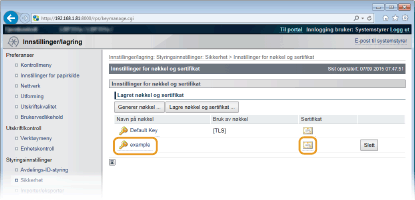 Et nøkkelpar kan ikke slettes hvis det er i bruk til et formål, for eksempel når "TLS" eller "IEEE 802.1X" vises under [Bruk av nøkkel]. Hvis dette er tilfelle, må du aktivere funksjonen eller erstatte nøkkelparet før du sletter det.