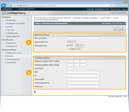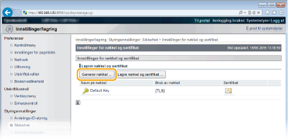Et nøkkelpar kan genereres med maskinen når det er nødvendig for kryptert kommunikasjon via Transport Layer Security (TLS). Du kan bruke TLS når du har tilgang til maskinen via Fjernkontroll eller utføre IPP-utskrift. Opptil åtte nøkkelpar, inklusive de forhåndsinstallerte parene, kan registreres. Egensignerte sertifikater brukes med nøkkelpar generert i "Nettverkskommunikasjon". Med en "Nøkkel og forespørsel om signering av sertifikat (CSR)" kan du søke om et CA-utstedt digitalt sertifikat for nøkkelparet generert av maskinen.