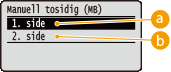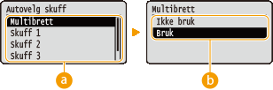 Når <MP-skuff for bl.frm.> er satt til <På>, mates papiret fortrinnsvis fra papriskuffen selv om <MB-skuffprioritet> er satt til <På>. |