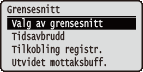 Alle innstillingene om grensesnitter for kommunikasjon med en datamaskin og USB er oppført med korte beskrivelser. Standardinnstillinger er merket med en dolk ().