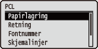 ![]() | Alle innstillingene PCL-kontrollkommandoene er oppført med korte beskrivelser. Standardinnstillinger er merket med en dolk ( ). |