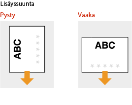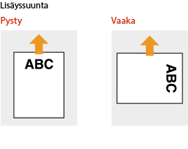Tässä osassa kuvataan pääasiassa, miten esipainettu paperi lisätään oikein päin ja oikeassa suunnassa. Kuvaus yleisistä toimista, jotka on tehtävä lisättäessä paperia paperikasettiin tai monitoimitasolle, on alla. |