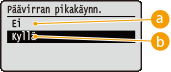 Kun laite suorittaa työtä tai on virhetilassa tai kun jotain asetusta on muutettu käyttöpaneelin tai etäkäyttöliittymän avulla, virtakytkimen painaminen ei käynnistä pikasammutusta vaan sammuttamisen. Jos virta katkaistaan sammuttamalla, vaikka pikakäynnistystoiminto on käytössä, laite käynnistyy normaalisti, kun virta kytketään seuraavan kerran. Jos suoritetaan automaattinen sammutusajastintoiminto, kun pikakäynnistystoiminto on käytössä, suoritetaan pikasammutus. Automaattisen sulkeutumisajan asettaminen Jos virta kytketään heti pikasammutuksen suorittamisen jälkeen, laitteen käynnistyminen voi kestää jonkin aikaa. |
