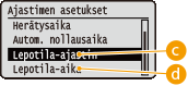 -painiketta. Voit myös käyttää Automaattinen lepotila-aika -toimintoa ja siirtää laitteen automaattisesti lepotilaan, jos sitä ei käytetä määritetyn ajan sisällä. Voit määrittää asetuksen, joka muuttaa automaattisen lepotilatoiminnon suorittamisväliä tai siirtää laitteen lepotilaan tiettyyn aikaan.