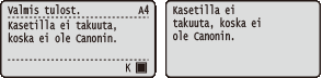 Kun ilmoitus <Väriainekasetin käyttöikä päättyy pian.> tulee esiin, tulostus pysäytetään tilapäisesti. Voit jatkaa tulostusta painamalla  (  ). Näytettävä ilmoitus riippuu käyttöpaneelin asetusvalikon <Toim. varoituksessa>-asetuksesta. Toim. varoituksessaVoit asettaa minkä tahansa väriainekasetissa jäljellä olevan määrän prosenttiarvona täydestä määrästä laukaisemaan tämän viestin. Määr. vär. tark.aj. |
