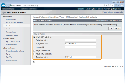 Käyttöpaneelin käyttäminenVoit ottaa SMB-palvelimen käyttöön tai pois käytöstä myös käyttöpaneelin asetusvalikosta. SMBVoit ottaa SMB-tulostuksen käyttöön tai pois käytöstä myös käyttöpaneelin asetusvalikosta. SMB |