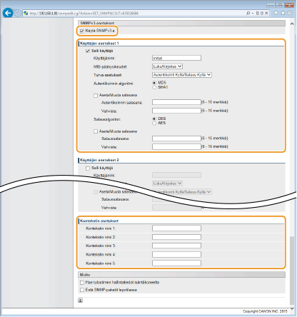 SNMP (Simple Network Management Protocol) on protokolla, jolla valvotaan ja ohjataan verkon tiedonsiirtolaitteita käyttämällä MIB:tä (Management Information Base). Laite tukee SNMPv1-protokollaa ja edistyneemmän suojauksen SNMPv3-protokollaa. Voit tarkistaa laitteen tilan tietokoneesta, kun tulostat asiakirjoja tai käytät Etäkäyttöliittymää. Voit ottaa käyttöön SNMPv1:n, SNMPv3:n tai molemmat samanaikaisesti. Määritä kunkin version asetukset verkkoympäristöön ja käyttötarkoitukseen sopiviksi.