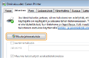 Kun suoritat seuraavat toimet, kirjaudu sisään tietokoneeseen pääkäyttäjänä. Tulostinajurien asentaminen verkon kautta ei välttämättä onnistu tulostuspalvelimen ja asiakastietokoneiden käyttöjärjestelmän ja bittiarkkitehtuurin (32-bittinen tai 64-bittinen) mukaan. Kun otat tulostuspalvelimen käyttöön toimialueympäristössä, ota yhteyttä verkon pääkäyttäjään. |