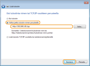 Jos haluat käyttää IPP:tä, syötä yhteyskohteeksi "http://<laitteen IP-osoite>/ipp".