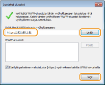 Varmista, että "https://<laitteen IP-osoite> tai <isäntänimi>.<toimialueen nimi>/" on näkyvissä, ja napsauta [Lisää]