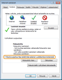 Jos valintaruudun [Käytä suojattua tilaa (edellyttää selaimen uudelleenkäynnistämistä)] valinta poistettiin vaiheessa 7, valitse valintaruutu.