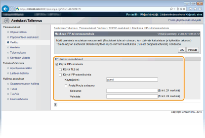 2 | Määritä asetukset tarpeen mukaan. ![]() [Käytä IPP-tulostusta] Valitse valintaruutu, jos IPP/IPPS:ää käytetään tulostukseen. Jos sitä ei käytetä, tyhjennä valintaruutu. [Käytä TLS:ää] Valitse valintaruutu, jos IPPS:ää (IPP-tulostus ja TLS-salattu tiedonsiirto) käytetään tulostukseen. Jos sitä ei käytetä, tyhjennä valintaruutu. ![]() Kun käytetään IPPS:ää, ota TLS-salattu tiedonsiirtotoiminto käyttöön. TLS:n käyttäminen salattuun tiedonsiirtoon ![]() Jos [Avainalgoritmi]-vaihtoehdoksi valitaan [RSA], kun luodaan verkkotietoliikenteessä käytettävää avainta, aseta avaimen pituudeksi vähintään [1024-bittinen]. Käytettävän käyttöjärjestelmän mukaan IPPS-tulostusta ei välttämättä voi suorittaa oikein, jos avaimen pituudeksi asetetaan [512-bittinen]. [Käytä IPP-autentikointia] Jos käytetään IPP-tulostuksen käyttäjien todennustoimintoa ,valitse valintaruutu ja määritä käyttäjänimi ja salasana. Jos sitä ei käytetä, tyhjennä valintaruutu. [Käyttäjänimi] Syötä aakkosnumeerisia merkkejä IPP-todennuksessa käytettäväksi käyttäjänimeksi. [Aseta/Muuta salasana] Jos haluat määrittää tai vaihtaa salasanan, valitse valintaruutu ja syötä salasanaa varten aakkosnumeerisia merkkejä [Salasana]-tekstiruutuun. Syötä vahvistukseksi sama salasana [Vahvista]-tekstiruutuun. |
