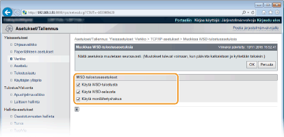 2 | Määritä asetukset tarpeen mukaan. ![]() [Käytä WSD-tulostusta] Valitse valintaruutu, jos WSD:tä käytetään tulostukseen. Tyhjennä valintaruutu, jos sitä ei käytetä. [Käytä WSD-selausta] Valitse valintaruutu, kun haluat hakea laitteen tiedot tietokoneesta WSD:n avulla. Tämä valintaruutu valitaan automaattisesti, kun [Käytä WSD-tulostusta] -valintaruutu on valittu. [Käytä monilähetyshakua] Valitse tämä valintaruutu, kun haluat asettaa laitteen vastaamaan monilähetyshaun pyyntöihin. Jos valintaruudun valinta poistetaan, laite pysyy lepotilassa myös silloin, kun verkossa on monilähetyshaun pyyntöjä. |