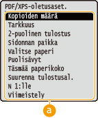 Asetuksia, jotka näytetään ensin tulostusasetusten määrittämistä varten, kutsutaan oletusasetuksiksi. Nämä oletusasetukset voidaan muuttaa vastaamaan usein suoritettavia toimenpiteitä, jotta samoja asetuksia ei tarvitsisi määrittää aina, kun tulostetaan.