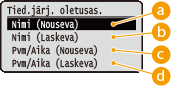 Voit määrittää järjestyksen, jossa USB-muistilaitteesta tulostettavat tiedostot näytetään valintaa varten.