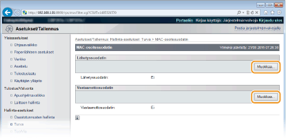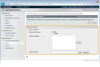 Osoitetta ei tarvitse erotella tavuviivoilla tai kaksoispisteillä. Tarkista, ettei syötössä ole tapahtunut virheitä Jos MAC-osoitteet on syötetty väärin, et ehkä pysty käyttämään laitetta Etäkäyttöliittymästä, missä tapauksessa sinun on asetettava <Osoitesuodatin>-asetukseksi <Ei>. Osoitesuodatin Kun on valittu [Hylkää] kohdassa [Oletustoimintaohjeet] Lähteviä monilähetys- ja sarjalähetyspaketteja ei voi suodattaa. MAC-osoitteen poistaminen poikkeuksista Valitse MAC-osoite ja valitse [Poista]. |