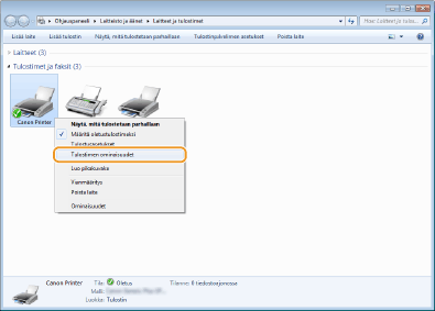 Napsauta tämän laitteen tulostinajurikuvaketta hiiren kakkospainikkeella ja napsauta [Tulostimen ominaisuudet] tai [Ominaisuudet].