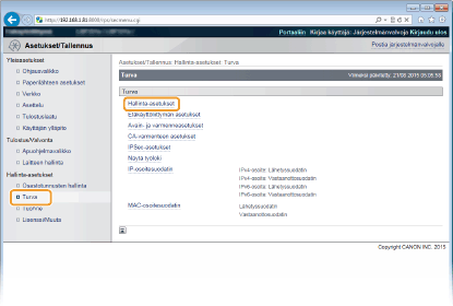 Kun tulostustoimenpiteitä on rajoitettuVain tallennetun työn tulostus voidaan suorittaa tulostinajureista. Laitteen muistiin tallennetun työn tulostaminen (tallennetun työn tulostus) Vain laatikoihin tallennettuja PDF-, PS-, EPS- ja XPS-tiedostoja voidaan tulostaa etäkäyttöliittymästä. Tulostaminen tiedostoa avaamatta (suoratulostus) USB-suoratulostus USB-muistilaitteesta ja sähköpostitulostus eivät ole käytettävissä. |