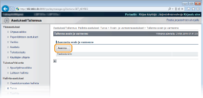 Avainparia ei voi poistaa, jos se on käytössä, esimerkiksi kun [TLS] tai [IEEE 802.1X] näytetään kohdassa [Avaimen käyttö]. Poista tässä tapauksessa toiminto käytöstä tai vaihda avainpari ennen sen poistamista. Esiasennettua CA-varmennetta ei voi poistaa.
