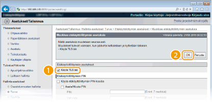 3 | Valitse [Käytä TLS:ää] -valintaruutu ja valitse [OK]. [Käytä TLS:ää] Valitse valintaruutu, kun käytetään TLS:ää etäkäyttöliittymän tiedonsiirtoon. Tyhjennä valintaruutu, kun sitä ei käytetä. |